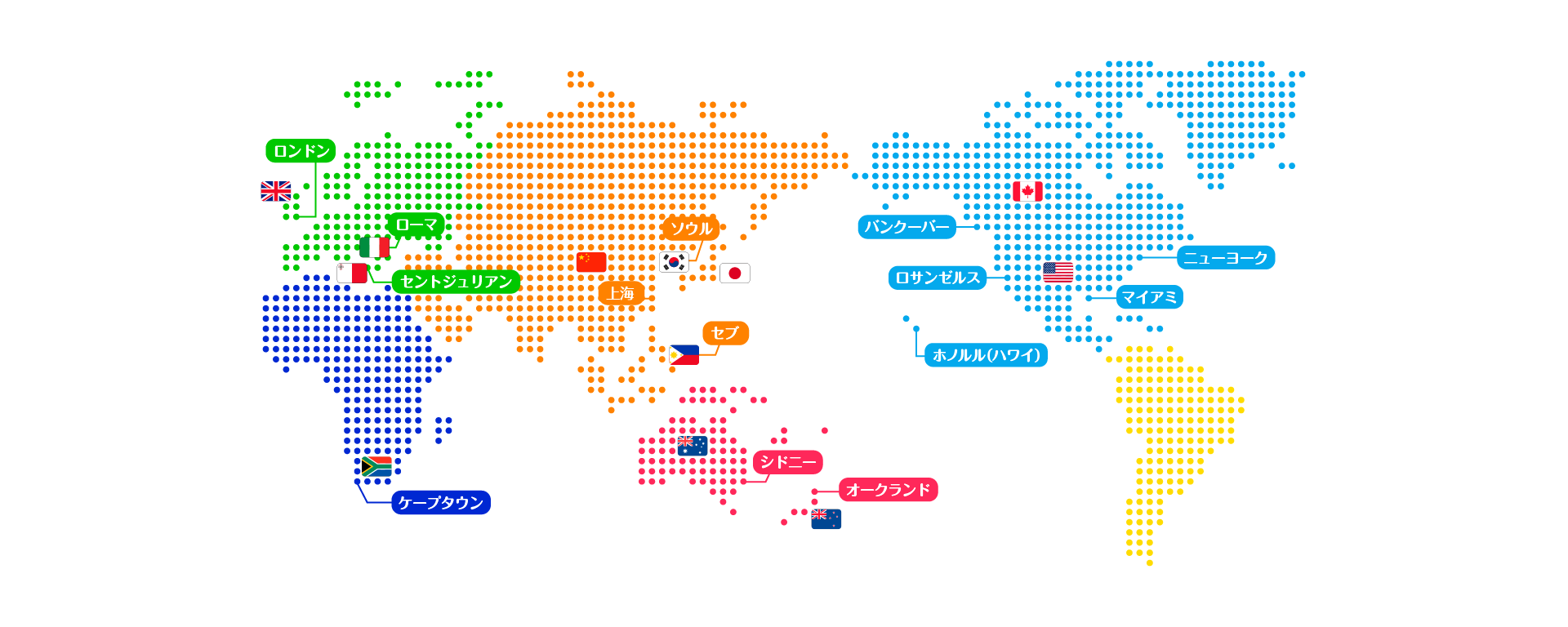 - ニューヨーク、マイアミ、シカゴ、ボストン、シアトル、ロサンゼルス、サンディエゴ、サンフランシスコ、ホノルル